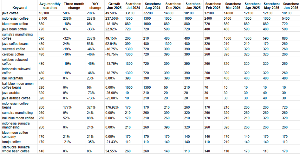 Di luar kata “java”, minat spesifik terhadap kopi Indonesia tumbuh sangat pesat. Kata kunci “indonesian coffee” mengalami pertumbuhan luar biasa dengan rata-rata 2.400 pencarian bulanan dan peningkatan year-on-year (YoY) sebesar 238%. Puncak pencarian terjadi pada Juni 2025, mencapai 5.400 pencarian. Begitu pula dengan “indonesian coffee beans” yang melonjak 324% YoY, memperlihatkan tren konsumen yang semakin tertarik pada kopi asal Indonesia, baik untuk kebutuhan konsumsi langsung maupun home brewing.